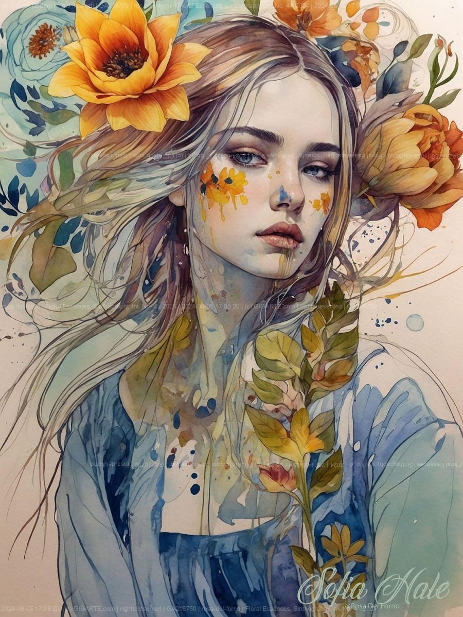 Un ritratto dolce e riflessivo di una donna circondata da una cornice naturale di fiori . Il contrasto tra la sua pelle luminosa e i toni caldi dei fiori crea un'atmosfera calda e accogliente. La sua espressione serena e lo sguardo distante riflettono un'introspezione profonda, mentre i dettagli minuti e la scelta di colori tenui evocano un senso di pace e contemplazione interna.