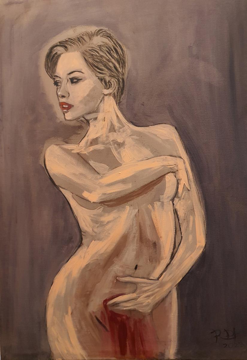 "Il velo di Arianna" ne è un esempio. Anche inquesto dipinto ritorna la carica espressionista del corpo femminile che allontana lo sguardo dallo spettatore alla ricerca di un oblio formale che si abbandona nel presente.